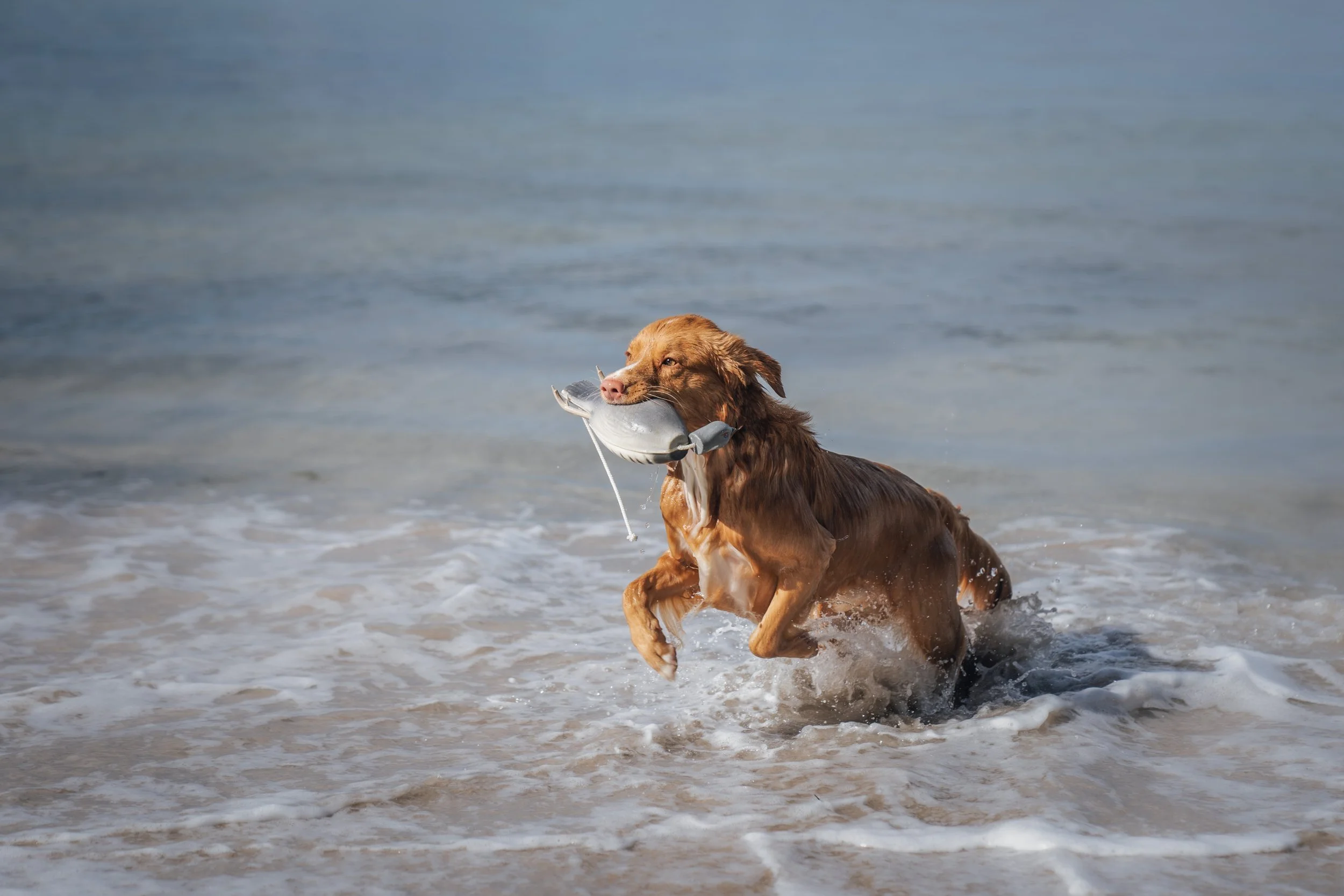 A strong and able swimmer, he is a natural and tenacious retriever on land and from water, setting himself for springy action the moment the slightest indication is given that retrieving is required. His strong retrieving desire and playfulness are qualities essential to his tolling ability.